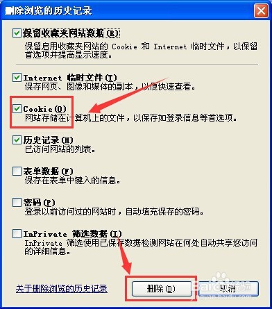 (3)弹出删除浏览的历史记录对话框,勾选Cookie选项,点击删除,即可删除Cookie。