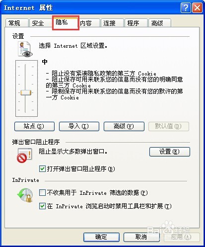 (4)禁用Cookie。在Internet属性对话框中点击隐私。