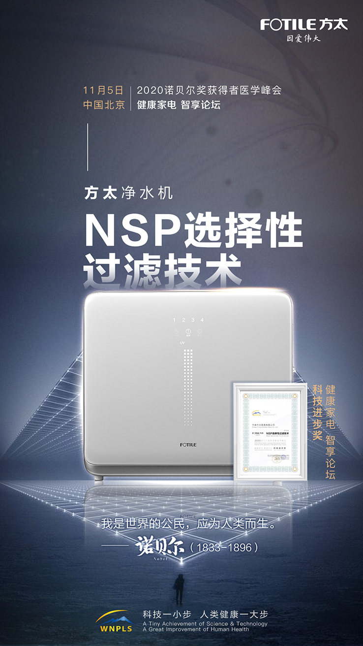 如今,技术和产品正式落地更是迎来好评不断。就像此次2020诺贝尔奖获得者医学峰会,方太凭借NSP选择性过滤膜在众多知名的净水机品牌中杀出重围,一举摘得“科技进步奖”桂冠,同时搭载这项全新技术的方太净水机也荣获了“指定健康产品”大奖就是很好的印证。诺贝尔奖获得者医学峰会的评选有着极其严苛的标准,参与评选的都是诺奖得主、学术巨擘、中外专家,在专业领域有着非常高的权威性和影响力,方太能得到这些嘉许足见NSP选择性过滤膜技术的水平之高。