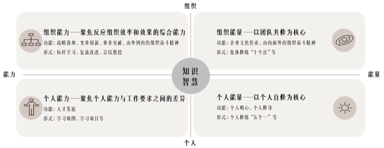 不仅提升能力,更提升能量。培训的本质是复制,其内容是知识与技能,其功能在于提升能力;教育的本质是唤醒,其内容是伦理道德和智慧真理,其功能在于提升能量。方太学校不仅要帮助员工实现职业的发展,更要帮助员工提升个人修为,让员工成为德才兼备、身心健康的社会成员,这与方太学校的组织架构板块也是相对应的。基于中西合璧的方太文化理念,从组织学习的视角,既通过培训提升员工个人和组织的能力,又通过教育提升员工个人和组织的能量。