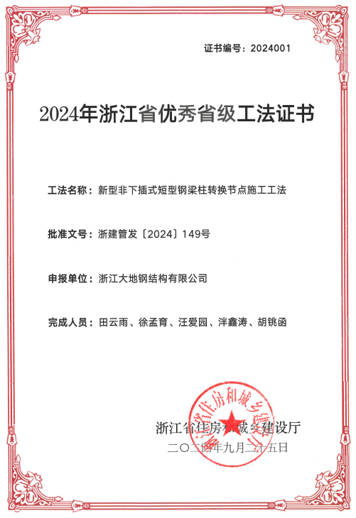 現代建築向多功能和綜合化方向發展迅速,因同一建築在豎向功能分配上的顯著差異或空間需求的不同,導緻上下層結構柱網無法完全匹配。我司聯合華東建築設計研究院有限公司通過技術研究、工藝創新,提出了一種适用于上述場景的非下插式短型鋼梁柱轉換節點施工技術并通過科學技術成果鑒定,總體達到國際先進水平,浙江省科學技術成果一項(登記号:DJ101002023Y0477)。施工過程中總結形成專利一項“鋼結構的臨時支架”(專利号:202222496709.8)。該技術采用混凝土梁内預埋連接短型鋼的優化型節點,取消通長型鋼,實現“強節點弱杆件”的精細化設計。通過項目的實際應用,該工法有着顯著減小用鋼量、優化鋼筋連接、便捷施工等優勢。《新型非下插式短型鋼梁柱轉換節點施工工法》獲“2024年浙江省優秀省級工法”。