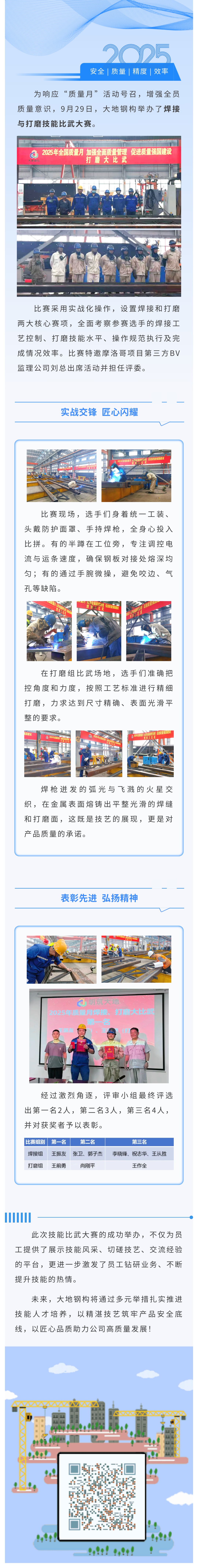近日,由大地鋼構參建的金鼎天地15-01地塊商辦項目A樓榮獲2024年度上海市白玉蘭優質建設工程。上海市建設工程“白玉蘭”獎是上海市建築行業工程質量的最高榮譽,旨在評選出質量卓越的工程項目,樹立行業質量标杆,推動上海市工程質量水平持續提升。此次獲獎,不僅是對項目品質的高度認可,更展現了大地鋼構的綜合實力。未來,公司将繼續秉持“服務築就價值、匠心承載未來”的理念,聚焦高品質工程建設與高效優質履約,不斷提升品牌影響力與市場競争力,為城市發展與行業進步貢獻力量。