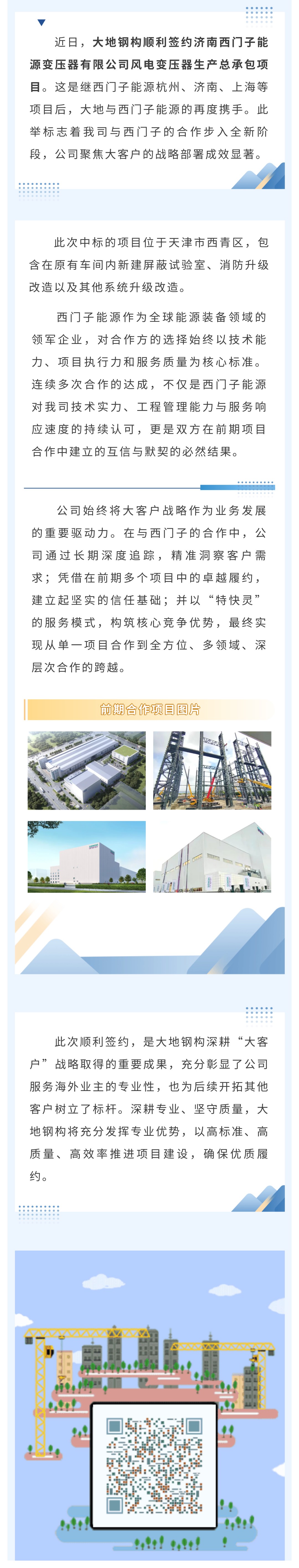 【概要描述】近日,大地鋼構順利簽約濟南西門子能源變壓器有限公司風電變壓器生産總承包項目。這是繼西門子能源杭州、濟南、上海等項目後,大地與西門子能源的再度攜手。此舉标志着我司與西門子的合作步入全新階段,公司聚焦大客戶的戰略部署成效顯著。此次順利簽約,是大地鋼構深耕“大客戶”戰略取得的重要成果,充分彰顯了公司服務海外業主的專業性,也為後續開拓其他客戶樹立了标杆。深耕專業、堅守質量,大地鋼構将充分發揮專業優勢,以高标準、高質量、高效率推進項目建設,确保優質履約。