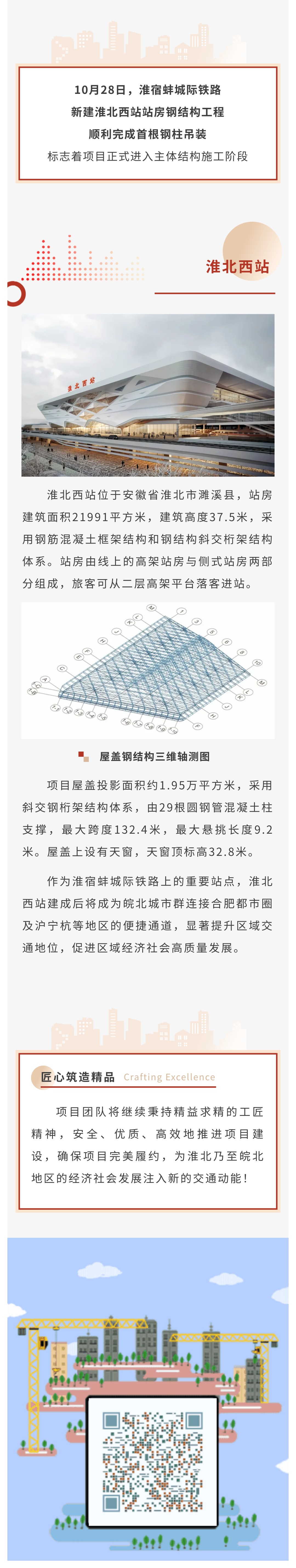 【概要描述】10月28日,淮宿蚌城際鐵路新建淮北西站站房鋼結構工程順利完成首根鋼柱吊裝,标志着項目正式進入主體結構施工階段。淮北西站位于安徽省淮北市濉溪縣,站房建築面積21991平方米,建築高度37.5米,采用鋼筋混凝土框架結構和鋼結構斜交桁架結構體系。站房由線上的高架站房與側式站房兩部分組成,旅客可從二層高架平台落客進站。項目屋蓋投影面積約1.95萬平方米,采用斜交鋼桁架結構體系,由29根圓鋼管混凝土柱支撐,最大跨度132.4米,最大懸挑長度9.2米。屋蓋上設有天窗,天窗頂标高32.8米。作為淮宿蚌城際鐵路上的重要站點,淮北西站建成後将成為皖北城市群連接合肥都市圈及滬甯杭等地區的便捷通道,顯著提升區域交通地位,促進區域經濟社會高質量發展。項目團隊将繼續秉持精益求精的工匠精神,安全、優質、高效地推進項目建設,确保項目完美履約,為淮北乃至皖北地區的經濟社會發展注入新的交通動能!