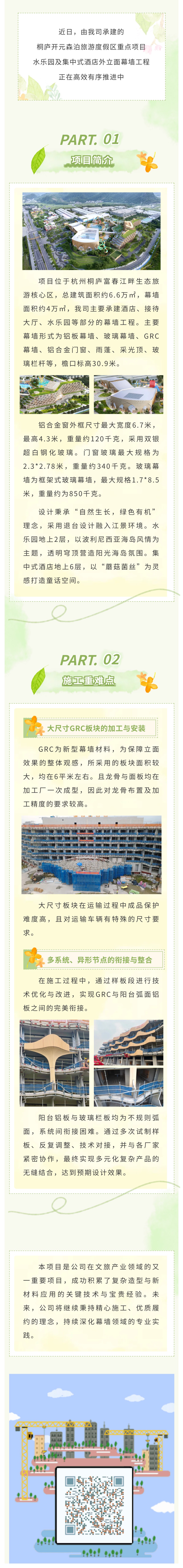 近日,由我司承建的桐廬開元森泊旅遊度假區重點項目——水樂園及集中式酒店外立面幕牆工程,正在高效有序推進中。項目位于杭州桐廬富春江畔生态旅遊核心區,總建築面積約6.6萬㎡,幕牆面積約4萬㎡,我司主要承建酒店、接待大廳、水樂園等部分的幕牆工程。主要幕牆形式為鋁闆幕牆、玻璃幕牆、GRC幕牆、鋁合金門窗、雨蓬、采光頂、玻璃欄杆等,檐口标高30.9米。鋁合金窗外框尺寸最大寬度6.7米,最高4.3米,重量約120千克,采用雙銀超白鋼化玻璃。門窗玻璃最大規格為2.3*2.78米,重量約340千克。玻璃幕牆為框架式玻璃幕牆,最大規格1.7*8.5米,重量約為850千克。設計秉承“自然生長,綠色有機”理念,采用退台設計融入江景環境。水樂園地上2層,以波利尼西亞海島風情為主題,透明穹頂營造陽光海島氛圍。集中式酒店地上6層,以“蘑菇菌絲”為靈感打造童話空間。
