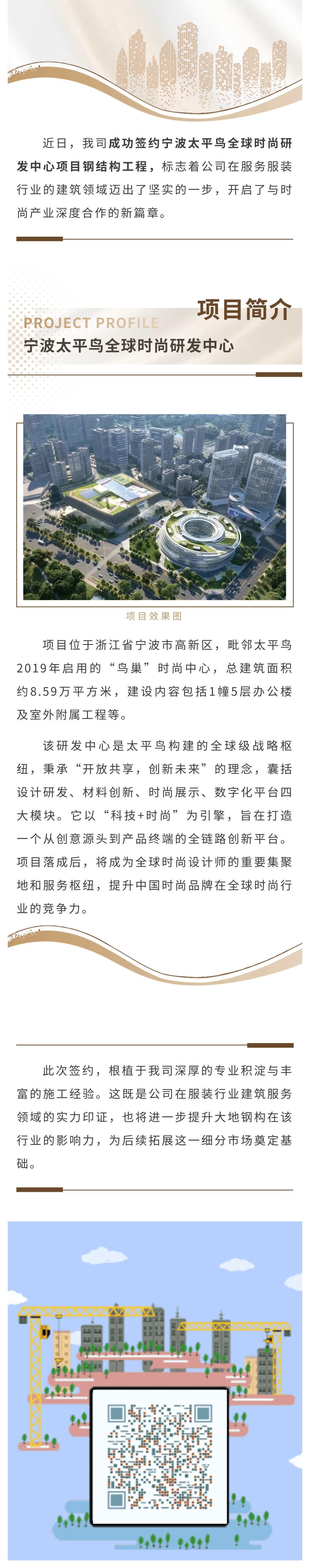 【概要描述】近日,我司成功簽約甯波太平鳥全球時尚研發中心項目鋼結構工程,标志着公司在服務服裝行業的建築領域邁出了堅實的一步,開啟了與時尚産業深度合作的新篇章。項目位于浙江省甯波市高新區,毗鄰太平鳥2019年啟用的“鳥巢”時尚中心,總建築面積約8.59萬平方米,建設内容包括1幢5層辦公樓及室外附屬工程等。該研發中心是太平鳥構建的全球級戰略樞紐,秉承“開放共享,創新未來”的理念,囊括設計研發、材料創新、時尚展示、數字化平台四大模塊。它以“科技+時尚”為引擎,旨在打造一個從創意源頭到産品終端的全鍊路創新平台。項目落成後,将成為全球時尚設計師的重要集聚地和服務樞紐,提升中國時尚品牌在全球時尚行業的競争力。此次簽約,根植于我司深厚的專業積澱與豐富的施工經驗。這既是公司在服裝行業建築服務領域的實力印證,也将進一步提升大地鋼構在該行業的影響力,為後續拓展這一細分市場奠定基礎。