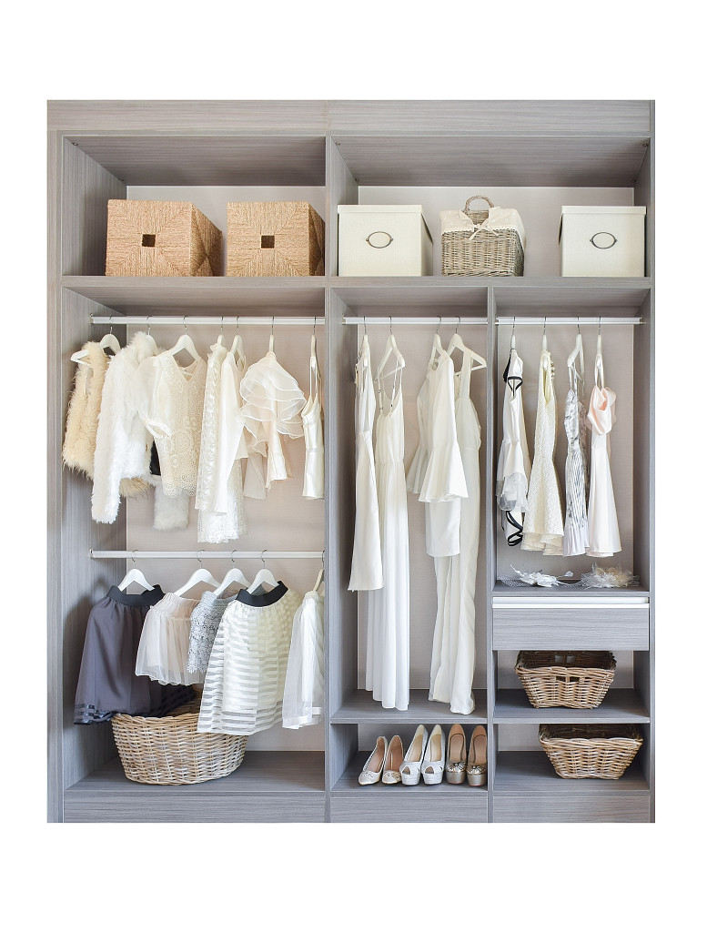 中层:(伸手可及的空间)悬挂为主,放常用的、正在用的、当季的衣服,如连衣裙、西装衬衫、大衣类