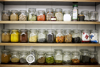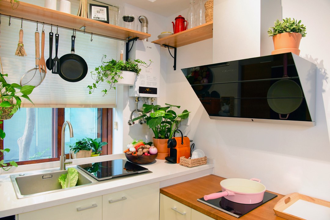 以厨房为例,如果家里的空间足够,可以单独开辟一个储物间用于存放各类物品;如果空间较小,可以在厨房的墙壁上方打造收纳的横栏或者储物柜,30-40cm宽,用以放置各类调味料、收纳盒,非常便捷。这个宽度的另一个好处是只能放置一排物品,避免拿取里面的物品而打乱了收纳物品的秩序。