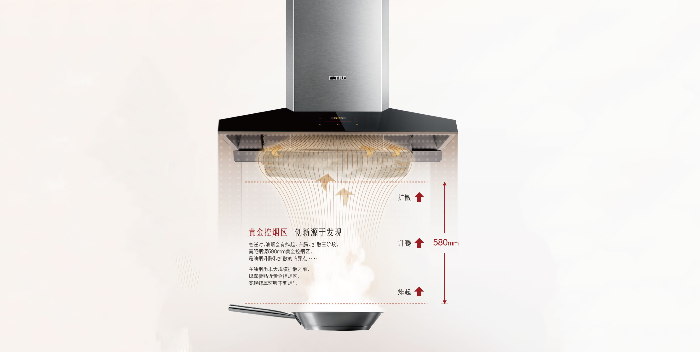 厨房炒菜时,油烟就像是一群准备越狱的乌合之众,经历三个阶段:炸起、升腾、扩散。这三个阶段是有迹可循的,通常在580mm左右的区域,油烟就开始四下逃逸,打算跑路。距离灶具面板580mm附近的高度就是方太提出的“黄金控烟区”,在这附近锁定油烟,抽吸效率会大大提高! 比如说方太智能升降云魔方的蝶翼板设计,根据油烟大小可以智能升降8-12cm,主动出击,在油烟扩散之前将他们捕获。
