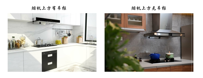 同样,顶吸式油烟机上方可以选择装上或者不装吊柜,建议油烟机底部跟吊柜底部平齐,这样更美观。每台油烟机说明书上都有建议安装高度,以及相关尺寸说明,安装橱柜时可以参考。